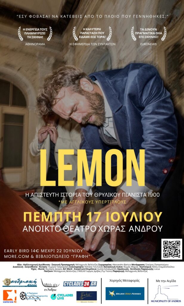 Κι έρχεται, υπό την αιγίδα του Δήμου Άνδρου, μεθαύριο Πέμπτη 17 Ιουλίου, στις 21:15, στο Ανοικτό Θέατρο της Χώρας η παράσταση Lemon, διάρκειας 70 λεπτών, με αγγλικούς υπέρτιτλους.
