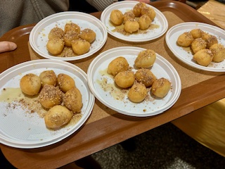Απόψε όμως, την ώρα του ηλιοβασιλέματος, ήταν το άρωμα από τους λουκουμάδες που με χαμόγελο ετοίμαζαν τα επαγγελματικά χέρια που γέμιζε τον αέρα. Το χρυσαφένιο τους χρώμα, το μέλι που γυαλίζει πάνω τους, η κανέλα όλα έμοιαζαν σαν ένα γλυκό καλωσόρισμα στην αποκριάτικη περίοδο.