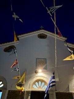 Η βραδιά όμως είχε και έντονο πνευματικό χαρακτήρα, καθώς συμμετείχαμε στον εσπερινό του Αγίου Χαραλάμπους στην εκκλησία του Αγίου Γεωργίου. Η ατμόσφαιρα μέσα στον ναό ήταν κατανυκτική. Το φως έπεφτε απαλά στις εικόνες, ενώ οι ψαλμωδίες δημιουργούσαν μια βαθιά αίσθηση ηρεμίας. Ο Δημητρός, πάντα υπέροχος ψαλμωδός και ο παπά Θεοδόσης συγκινημένος ανήγγειλε την αποχώρησή του.